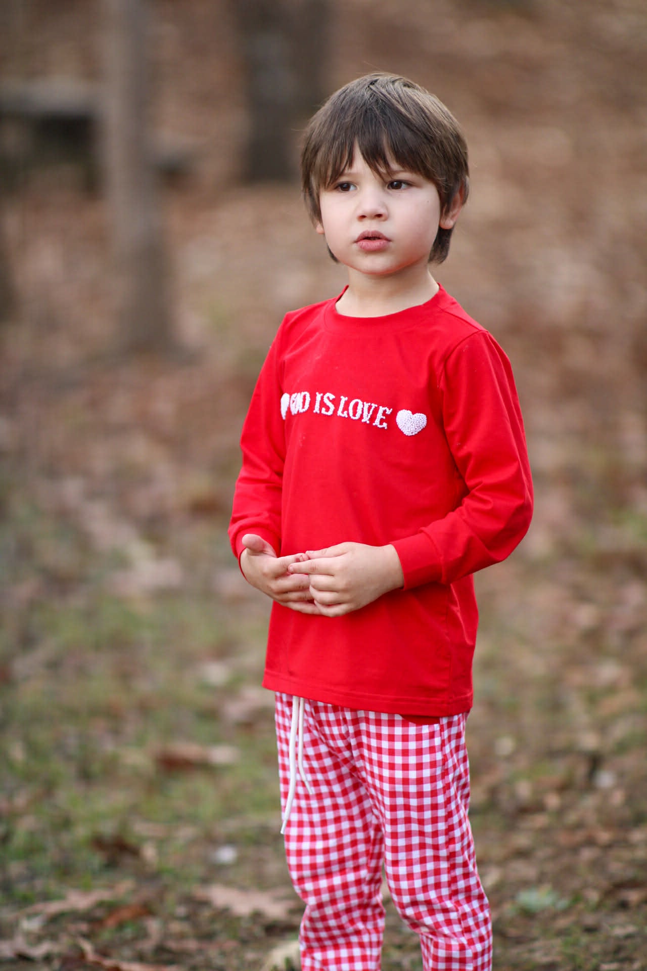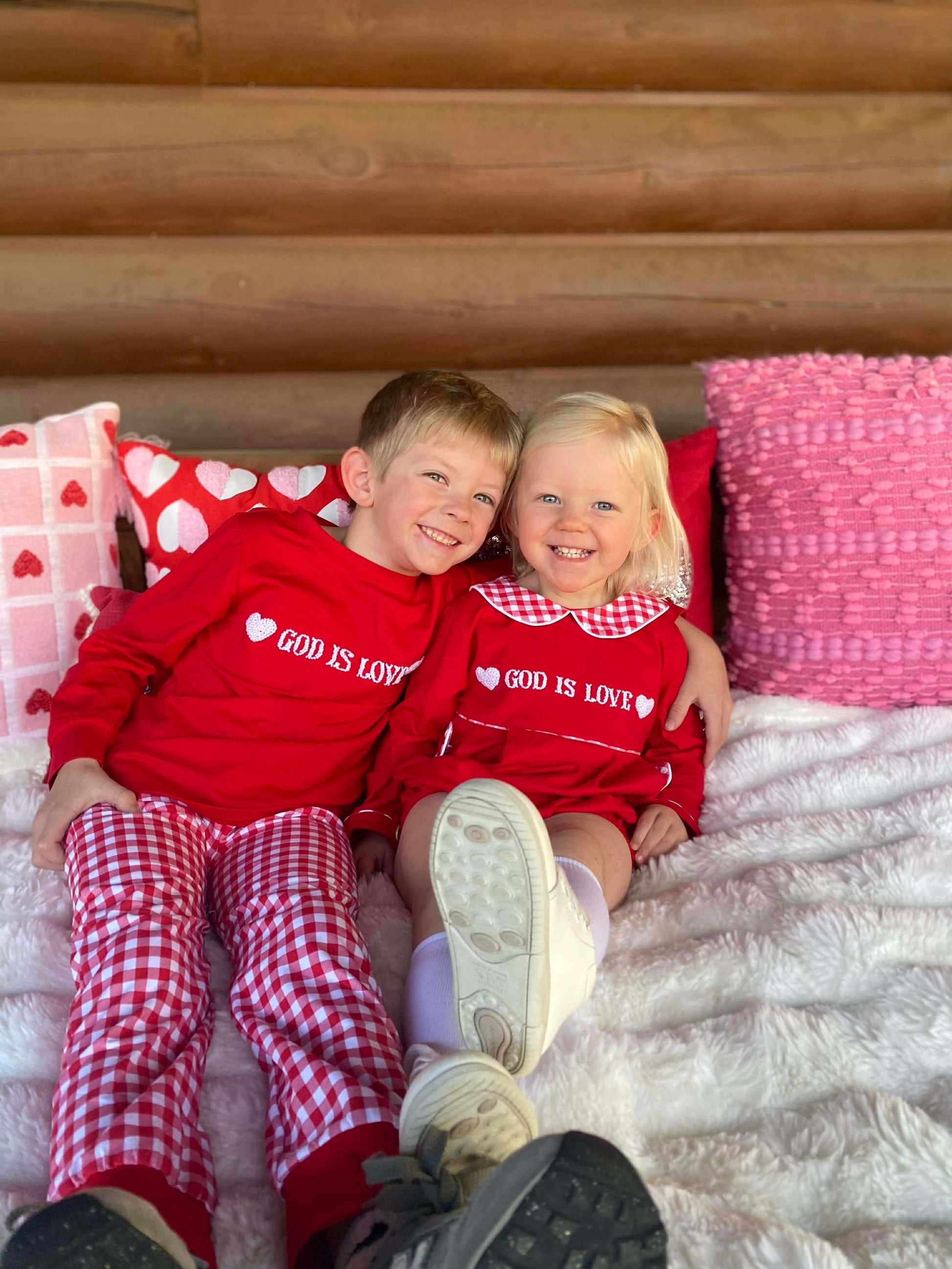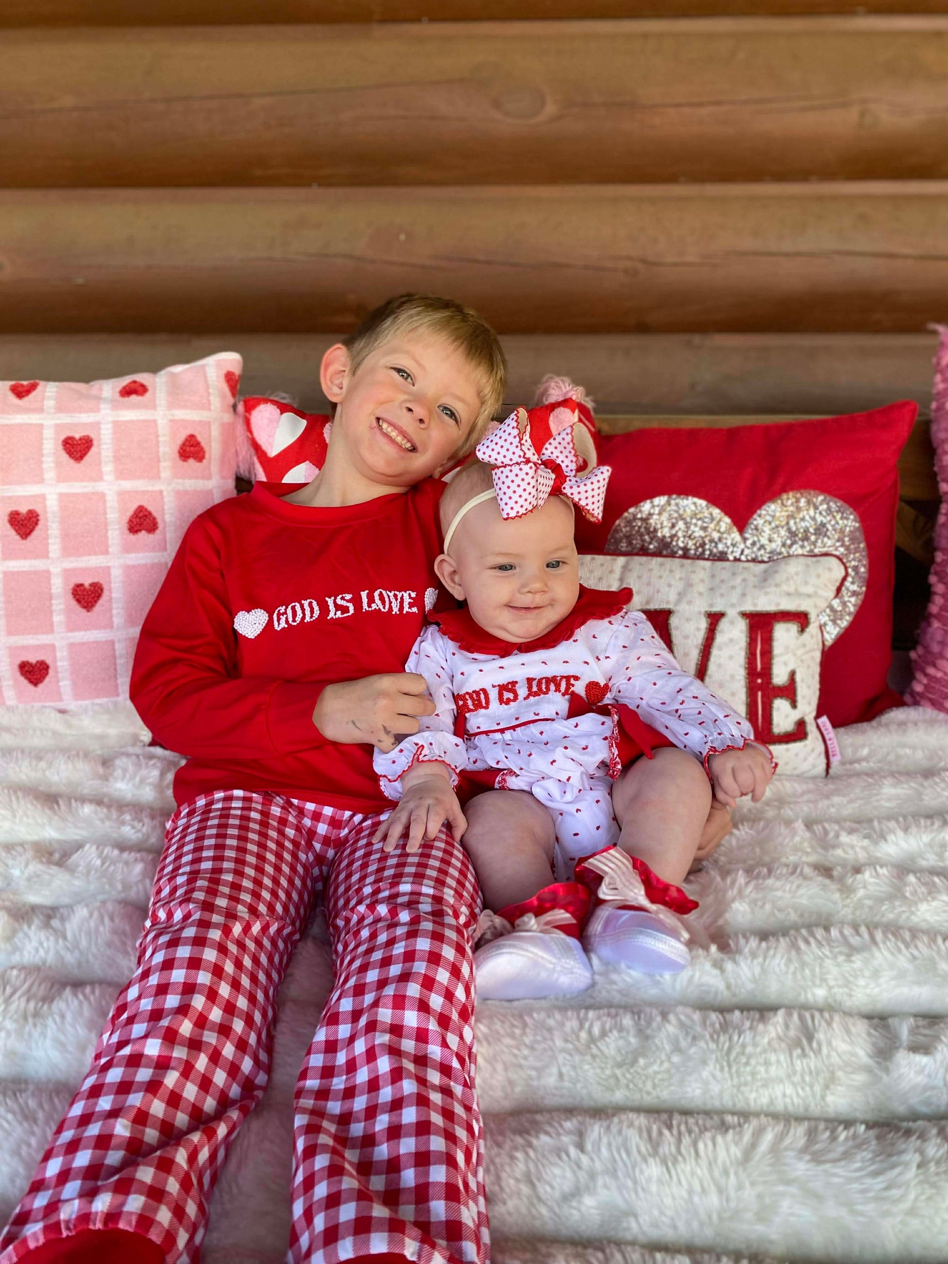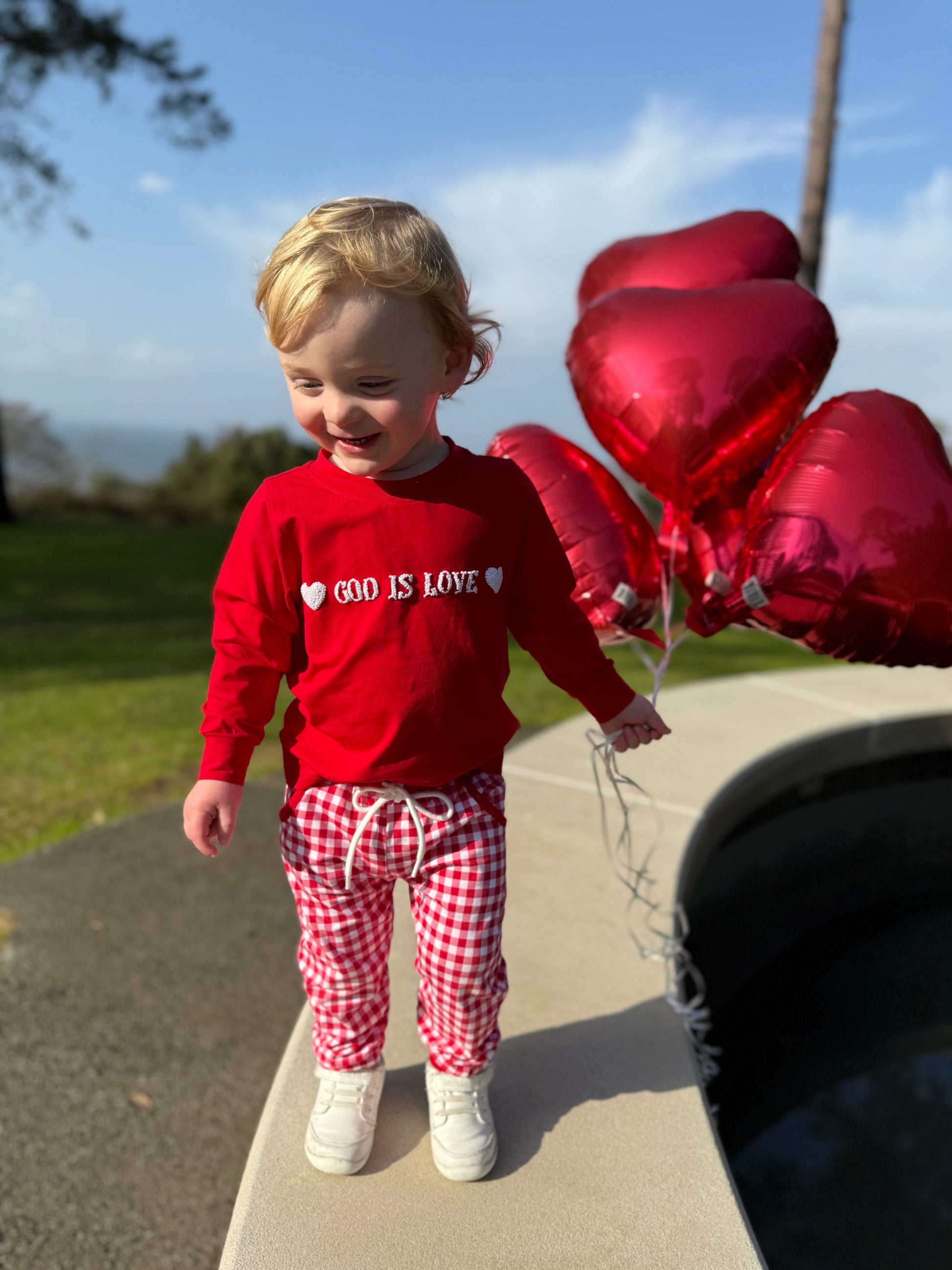 Our God Is Love Boys Jogger Set is a meaningful and comfortable outfit designed with timeless charm and everyday wear in mind. The soft red knit top features classic white French knot embroidery reading “God Is Love,” accented with hearts on each side for a sweet, faith-filled touch.