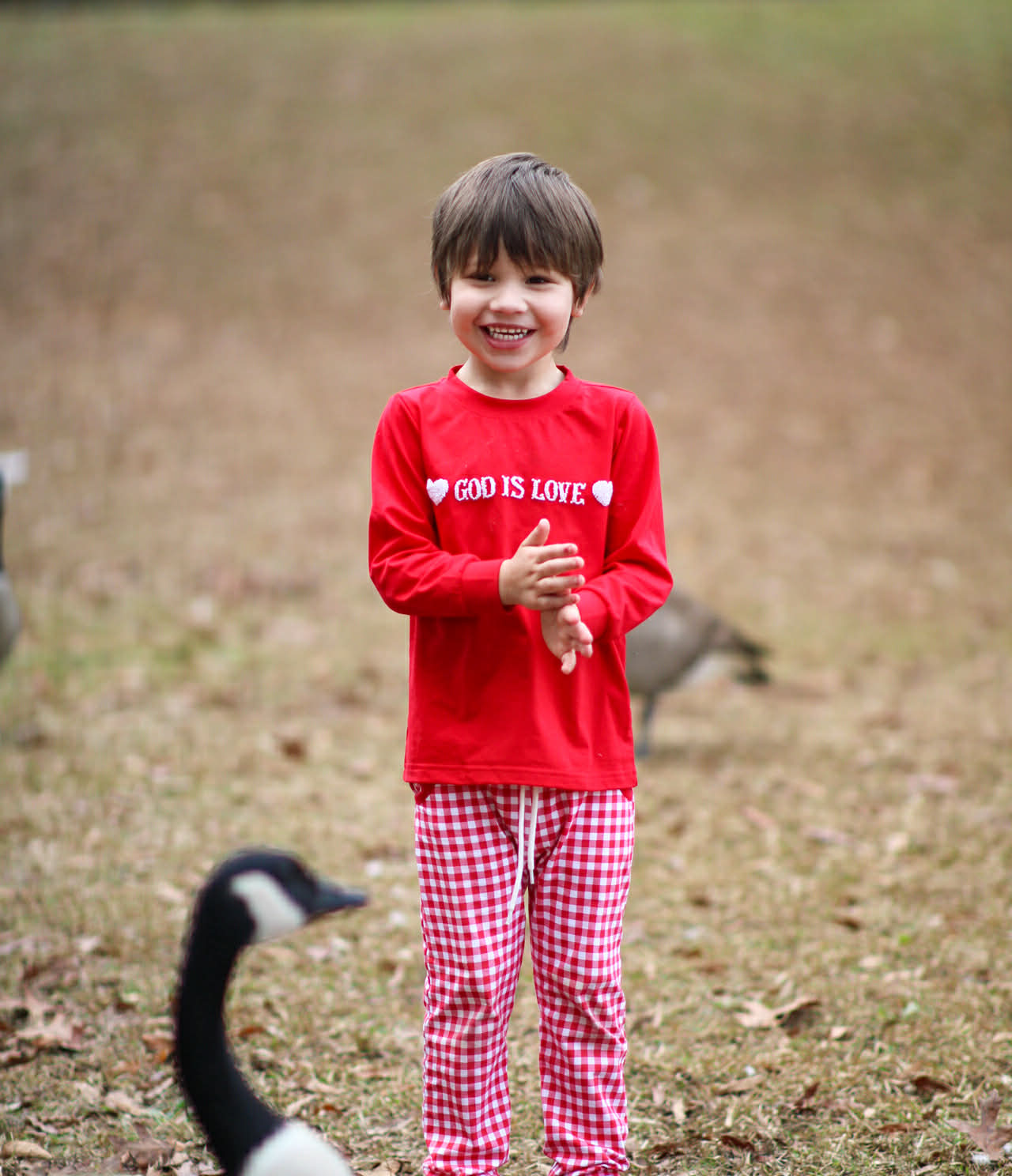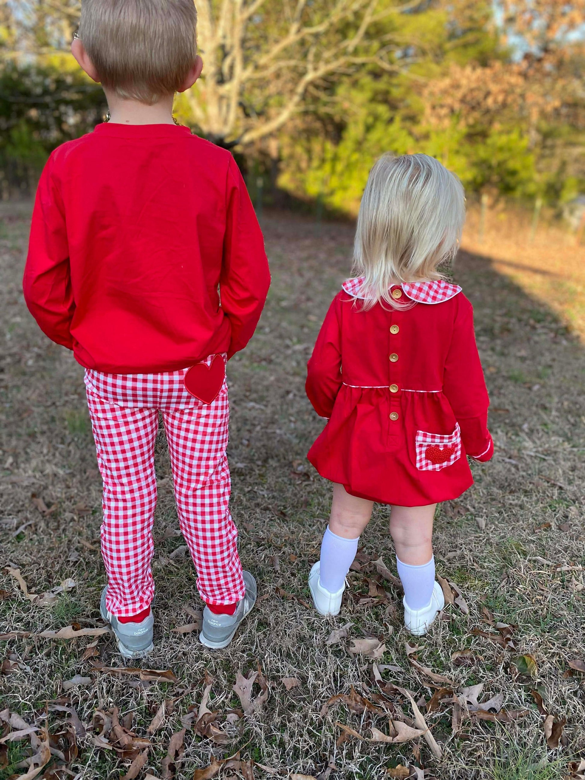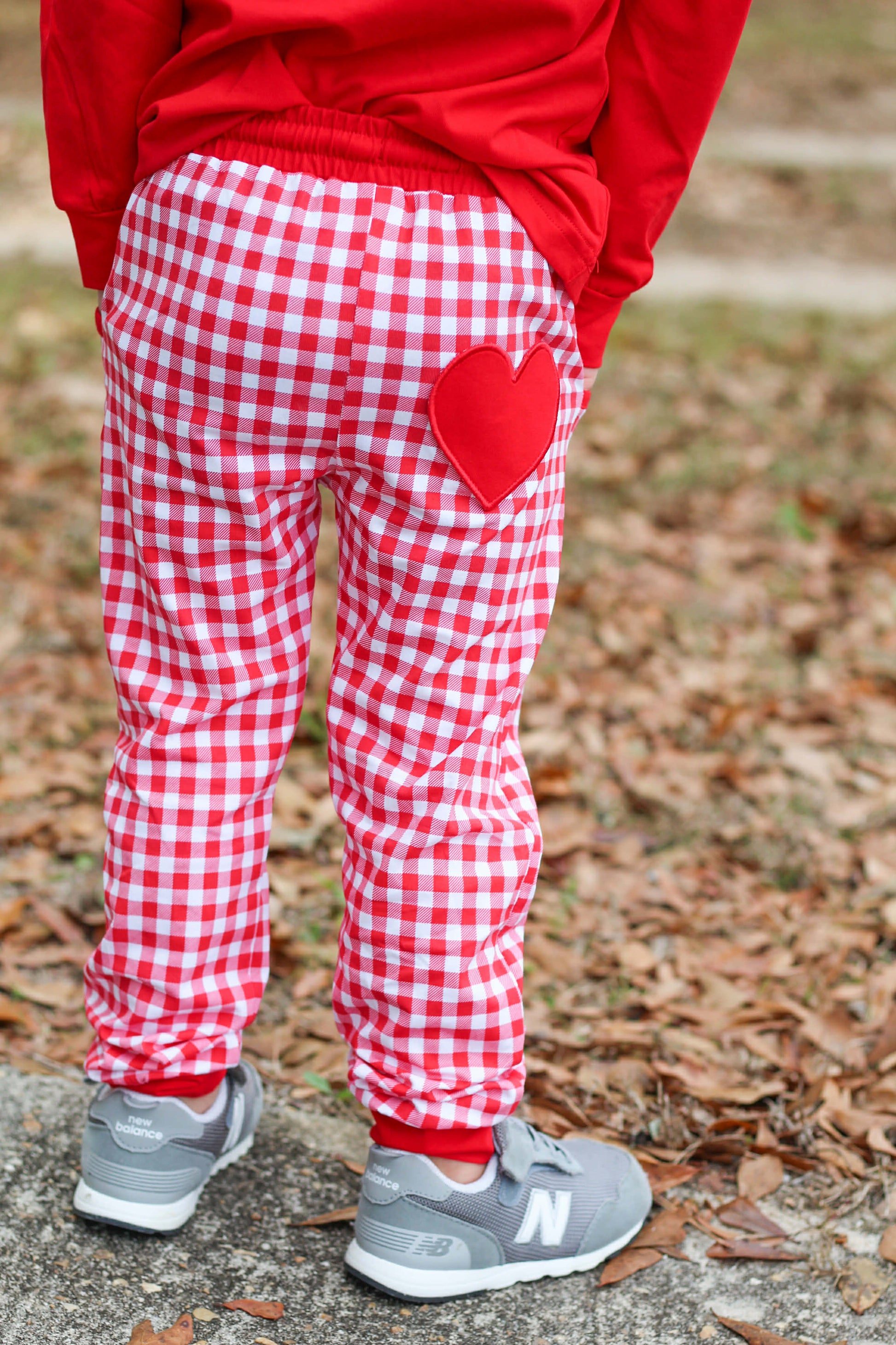 Paired with coordinating red knit gingham jogger pants, this set is as adorable as it is practical. The joggers feature a charming heart pocket on the back, adding a playful detail boys will love while keeping the look polished and put-together.