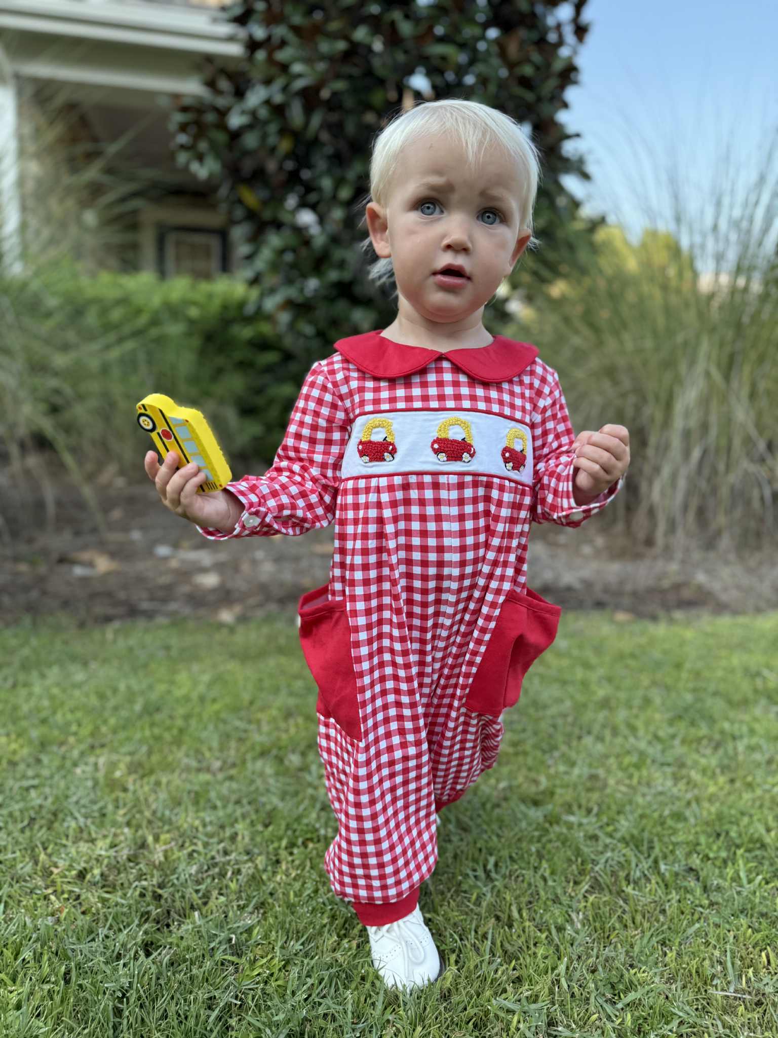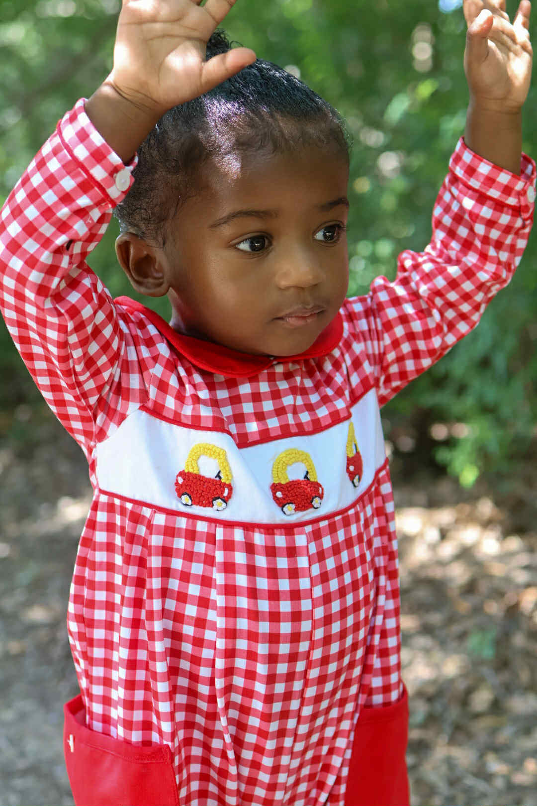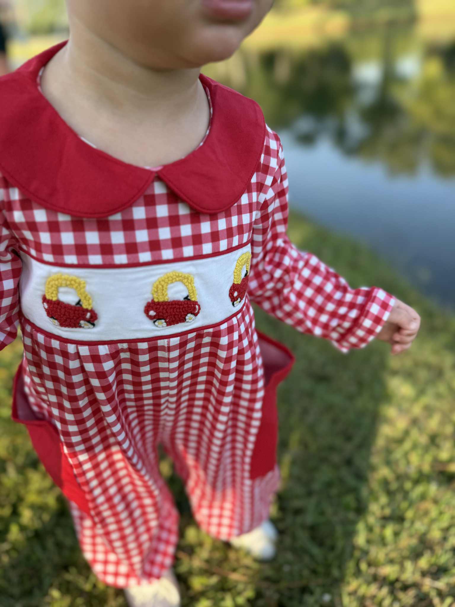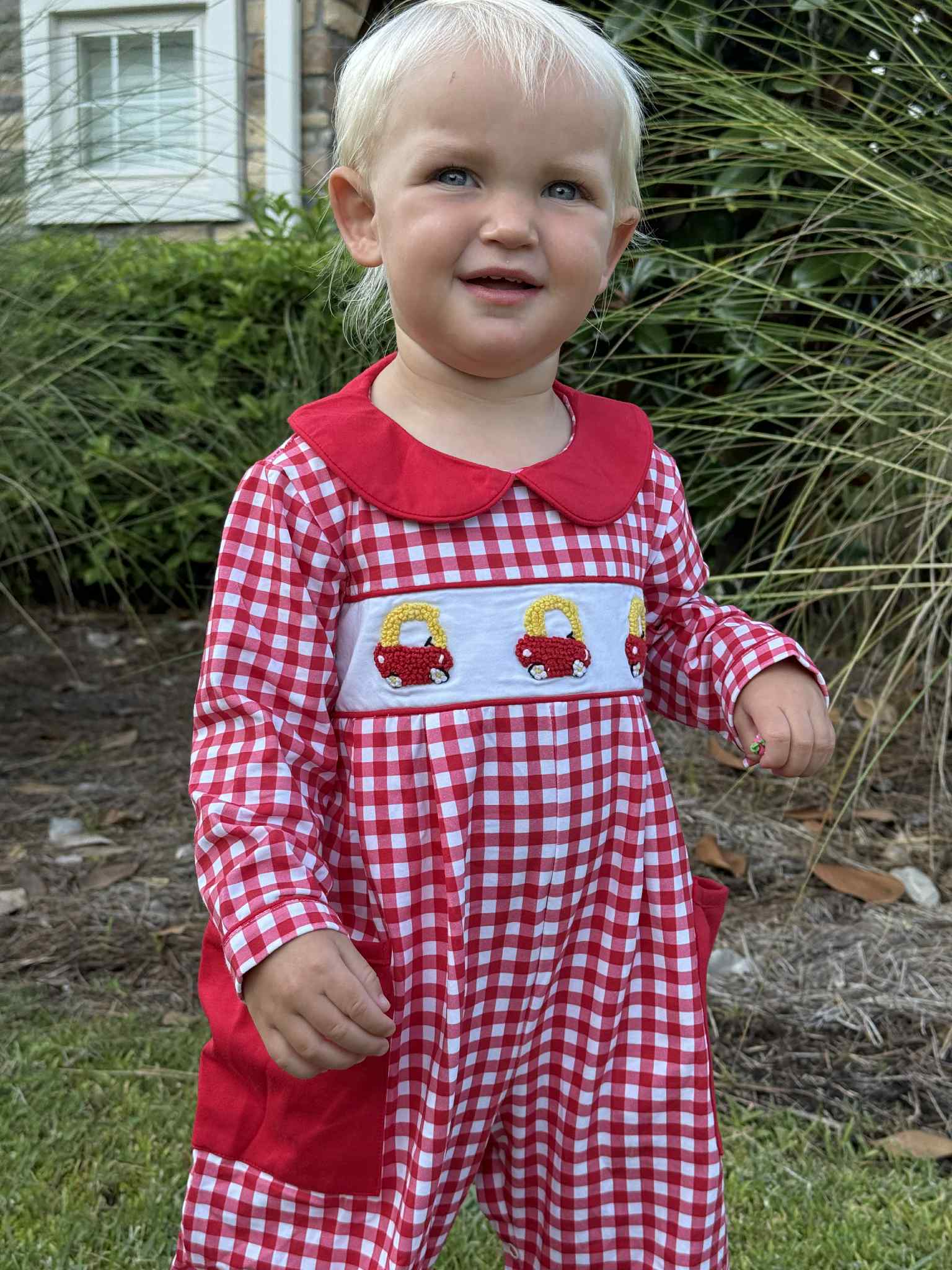 Classic and playful, this romper is a holiday must-have! Crafted in bright red gingham fabric, it features a crisp Peter Pan collar and handy side pockets for the sweetest little touch. The chest panel is detailed with hand-stitched French knot cozy coupe cars, making it a unique and timeless piece. Soft cuffs at the ankles ensures a comfy fit for all-day wear, while the long sleeves keep your little guy warm through the season. Perfect for Christmas gatherings, pictures, and play, this romper blends festive charm with everyday comfort.