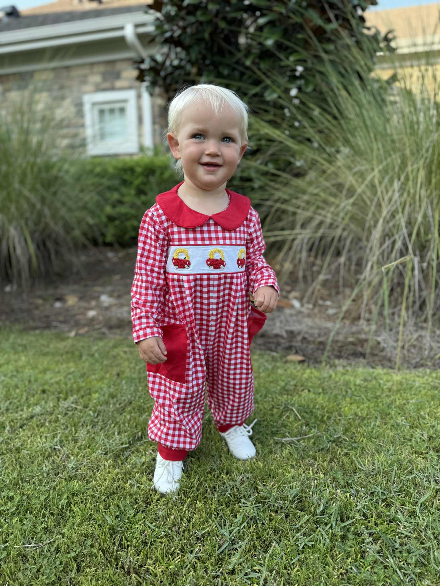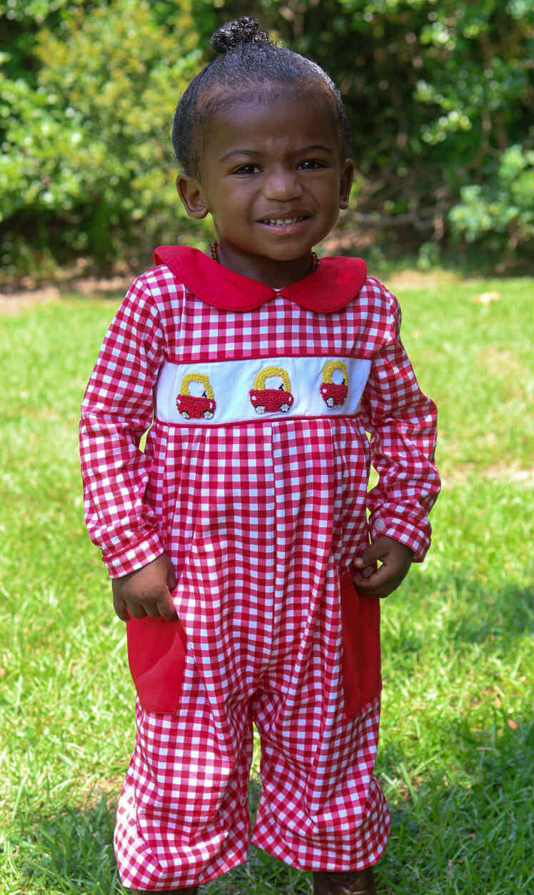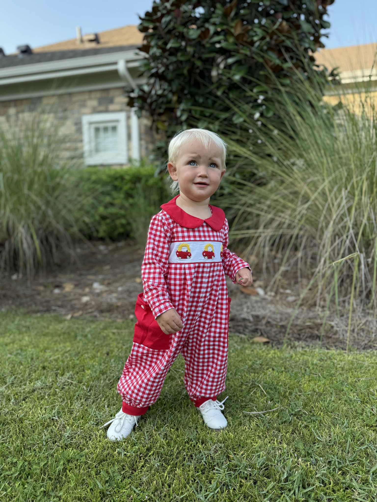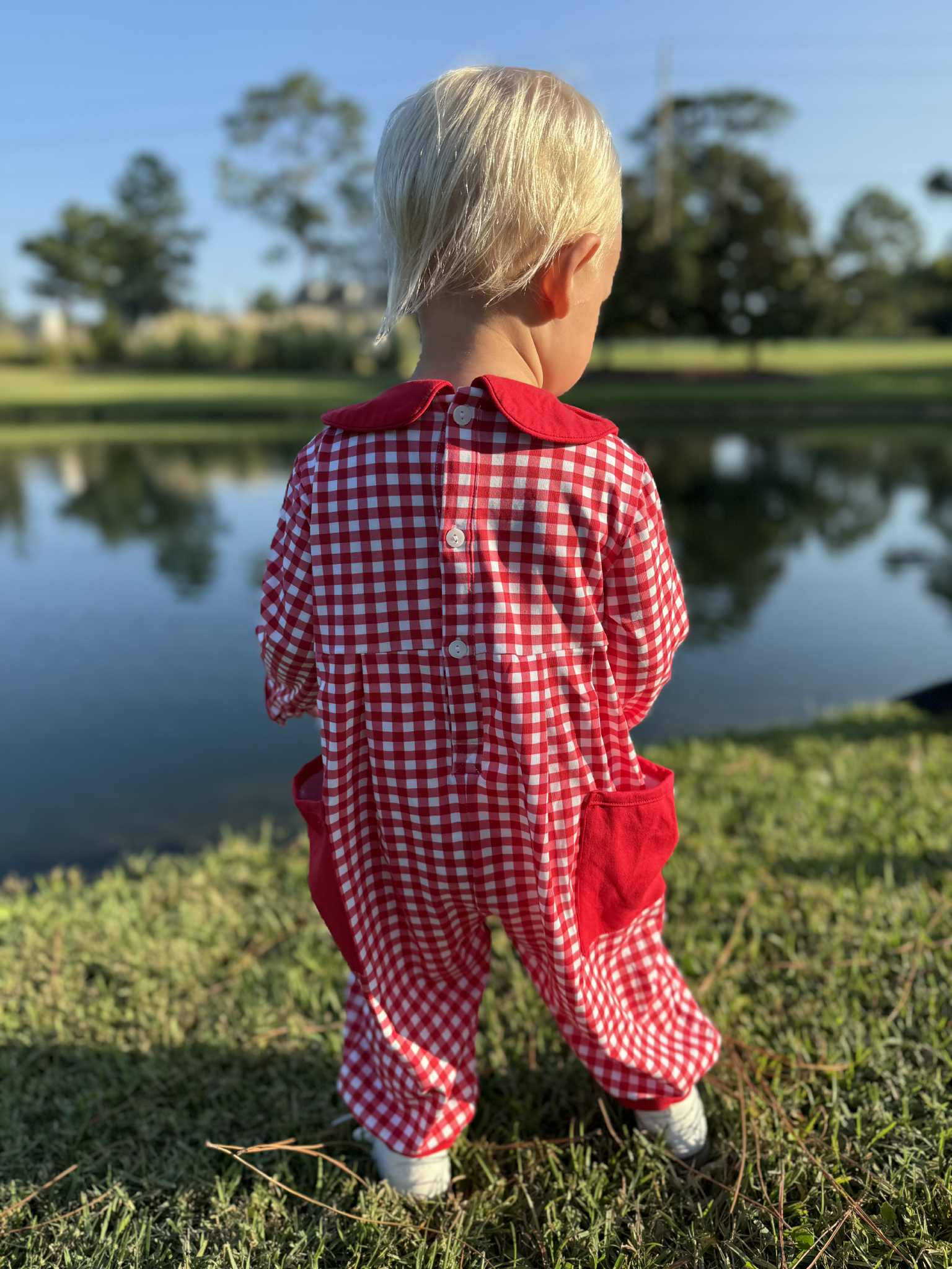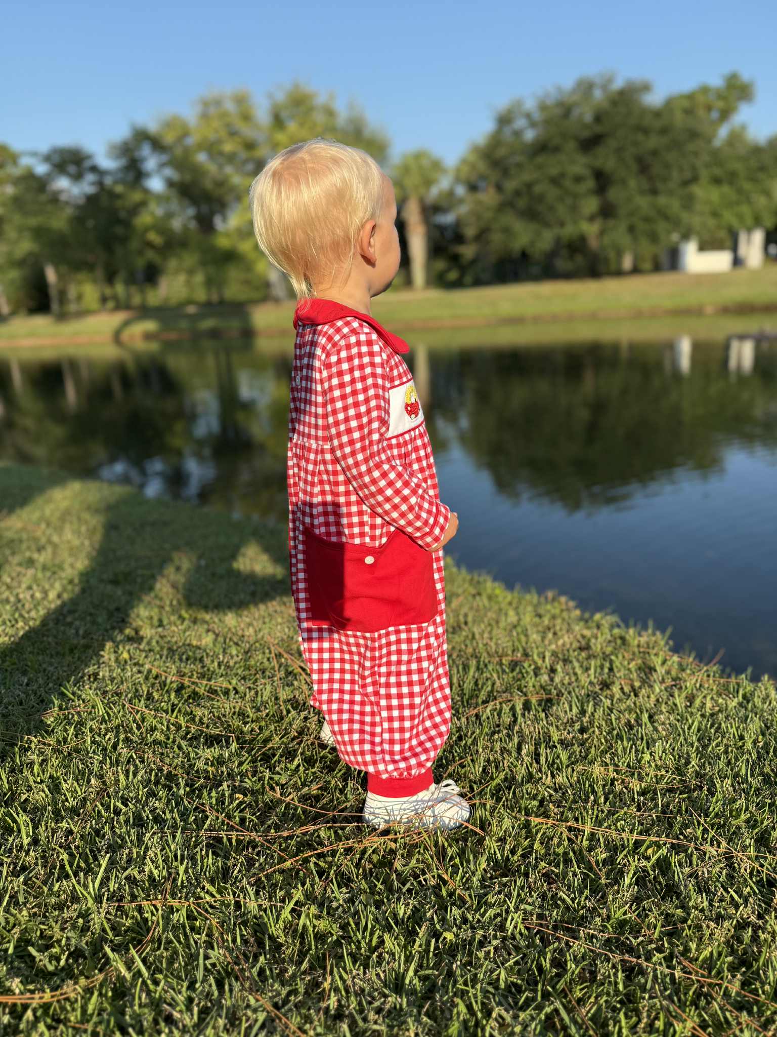 Classic and playful, this romper is a holiday must-have! Crafted in bright red gingham fabric, it features a crisp Peter Pan collar and handy side pockets for the sweetest little touch. The chest panel is detailed with hand-stitched French knot cozy coupe cars, making it a unique and timeless piece. Soft cuffs at the ankles ensures a comfy fit for all-day wear, while the long sleeves keep your little guy warm through the season. Perfect for Christmas gatherings, pictures, and play, this romper blends festive charm with everyday comfort.
