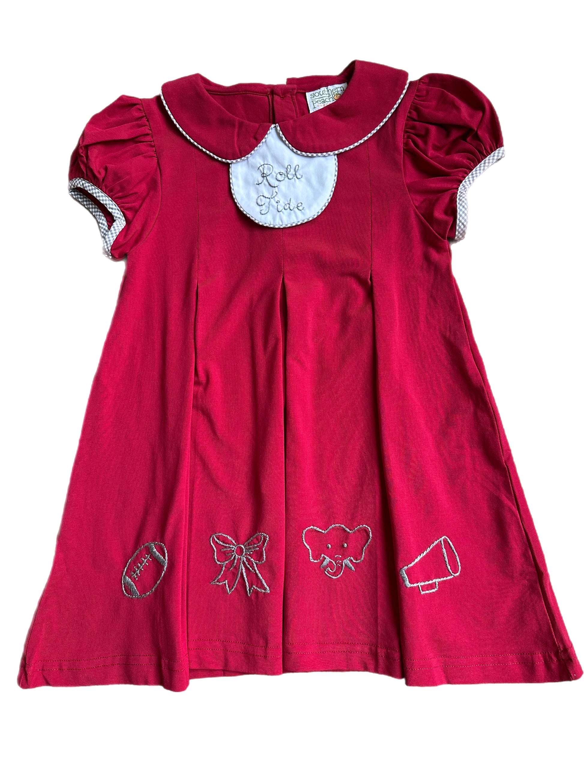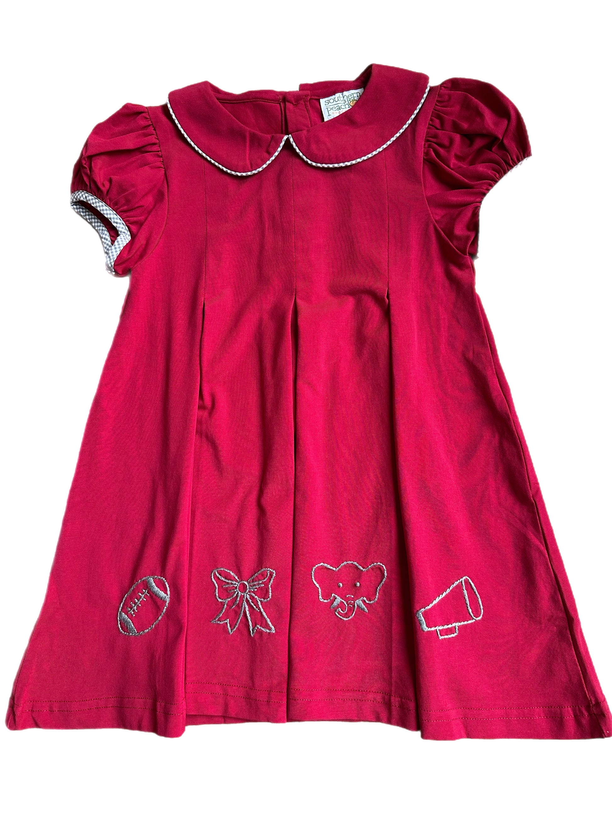 Bring all the team spirit with this darling Roll Tide Knit Dress! Made from soft crimson knit, it features crisp white embroidery along the hem—including a football, bow, elephant mascot, and megaphone—perfect for cheering on game day! The sweet puff sleeves and gingham trim add classic Southern charm.