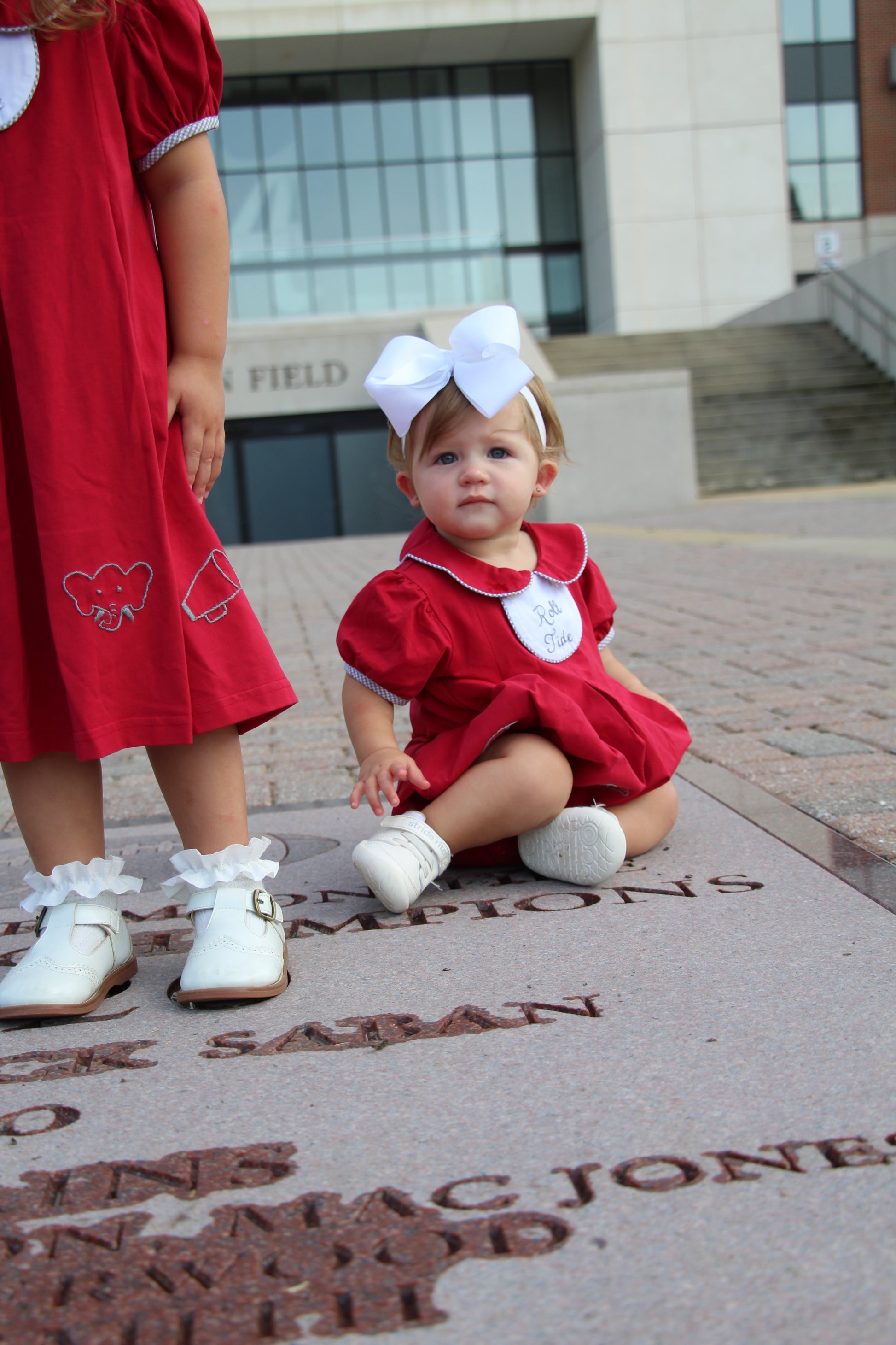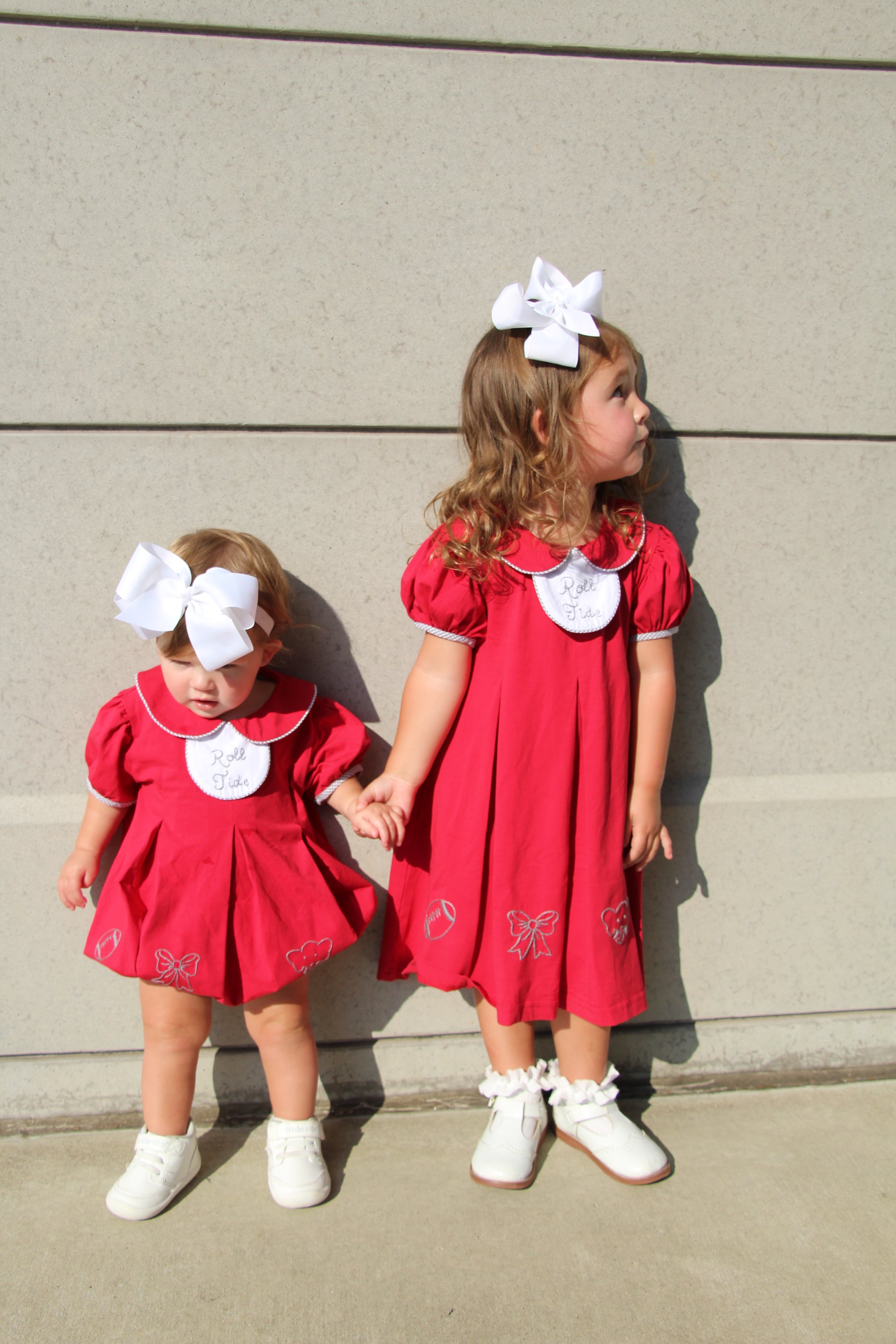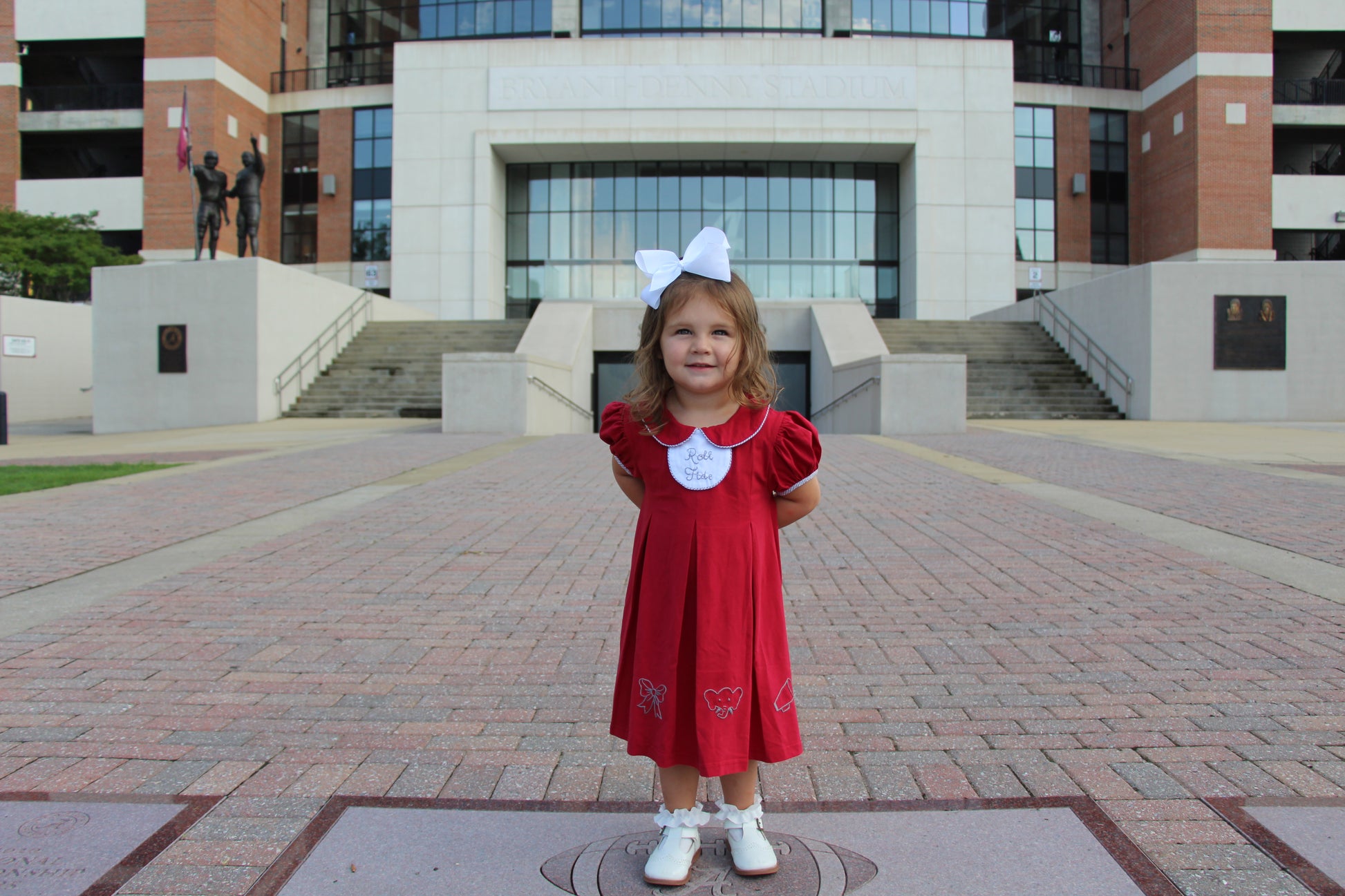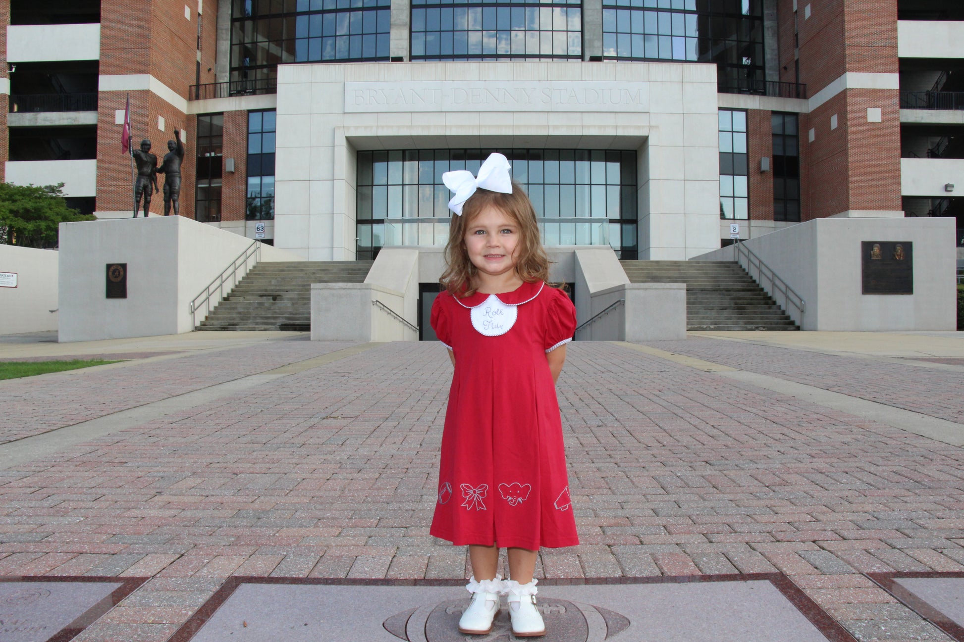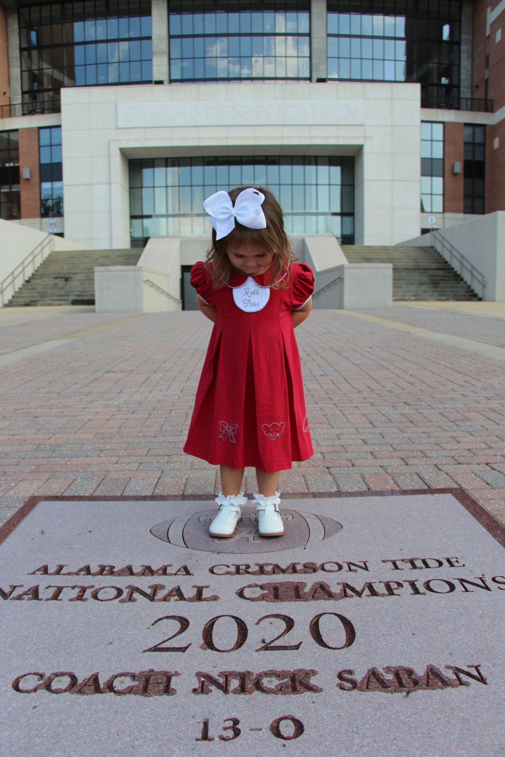 A removable “Roll Tide” collar tab lets her show off her Alabama pride in the cutest way. From tailgates to touchdowns, this dress is a must-have for your little fan!