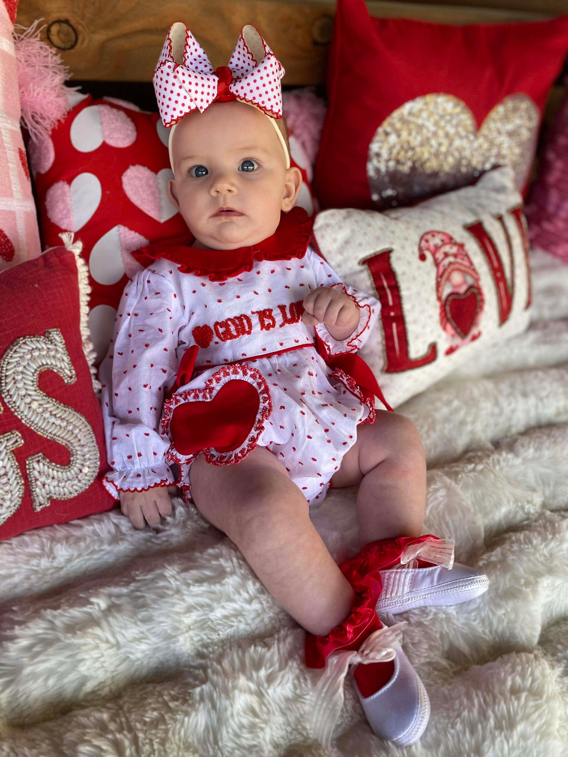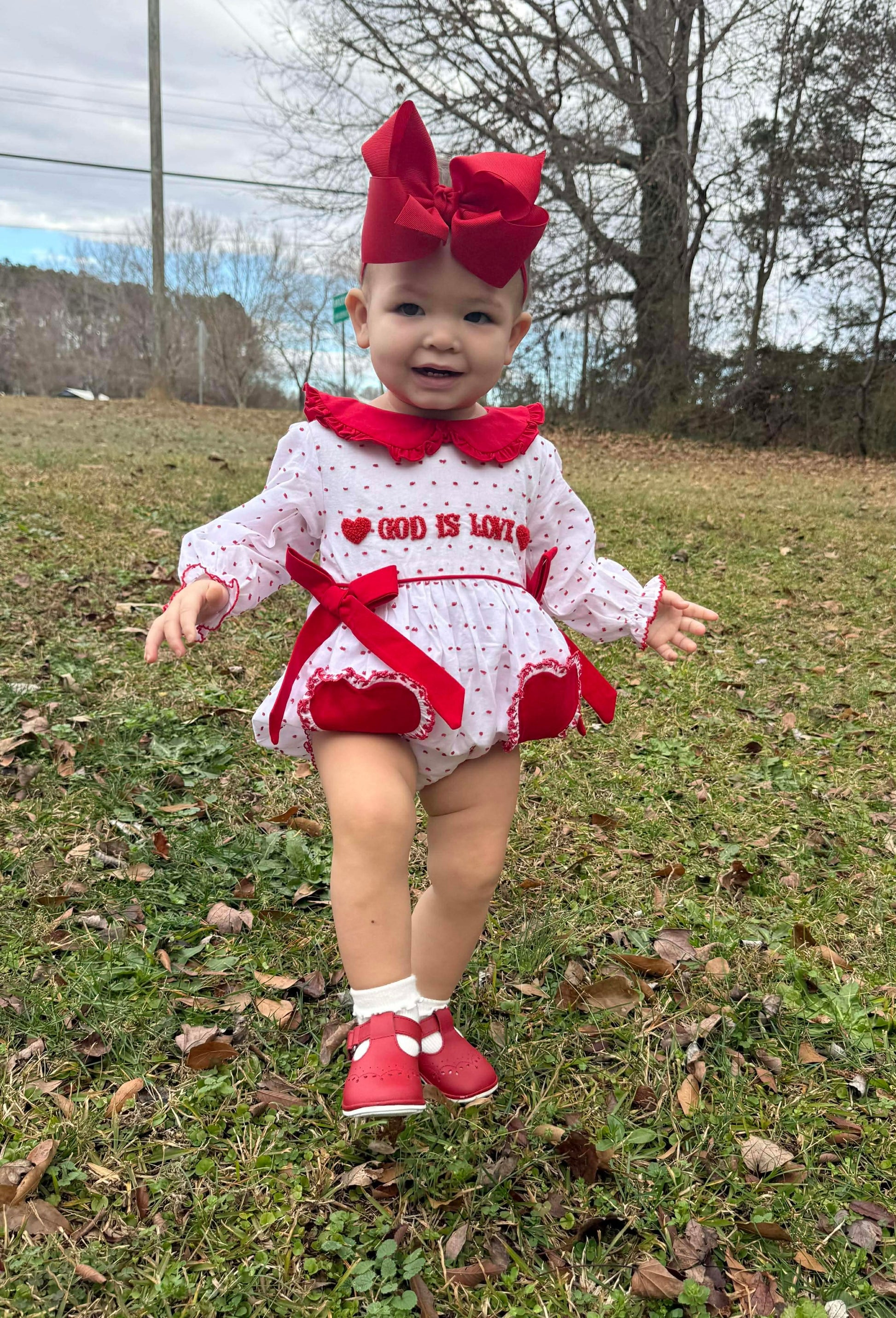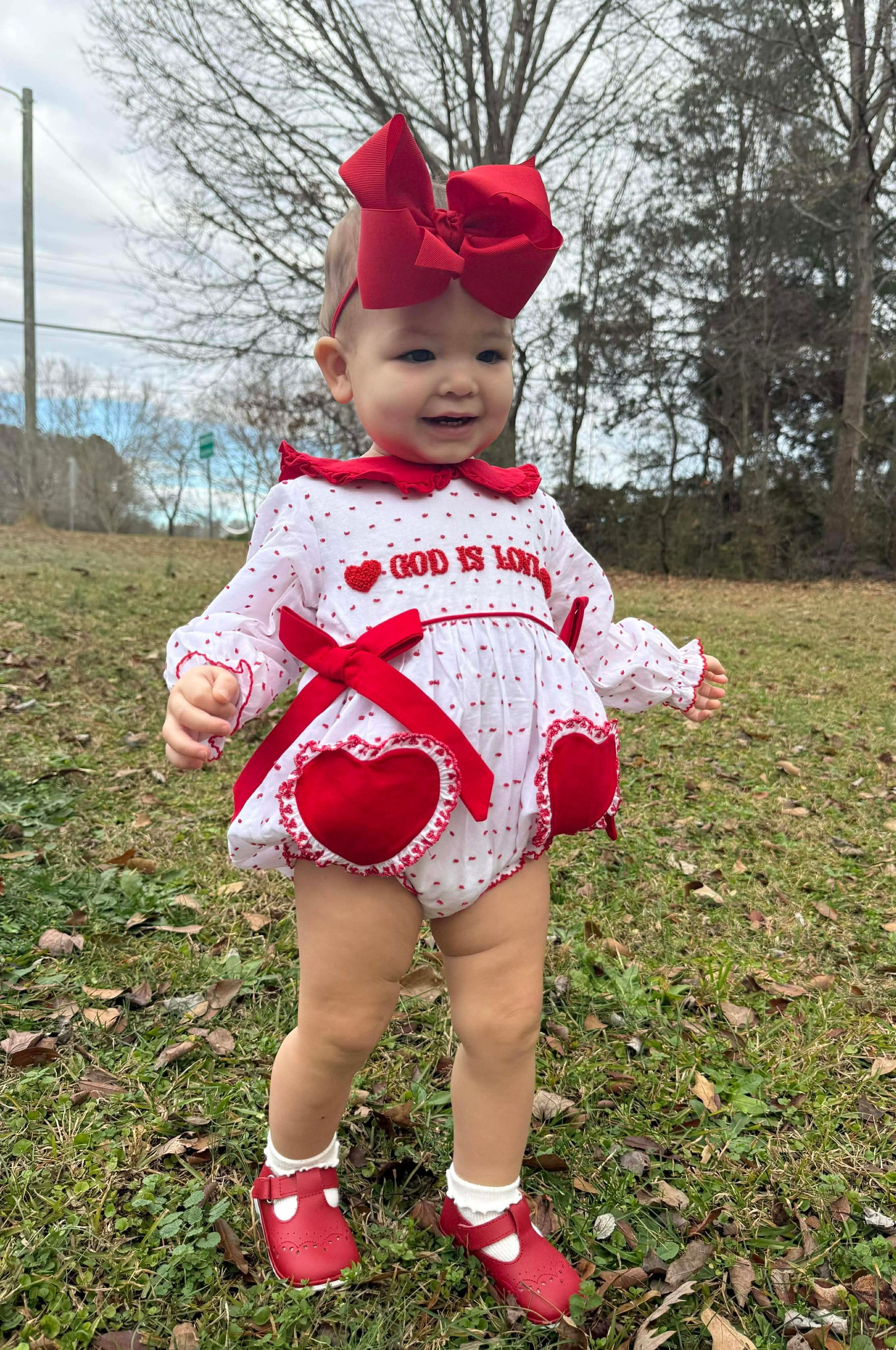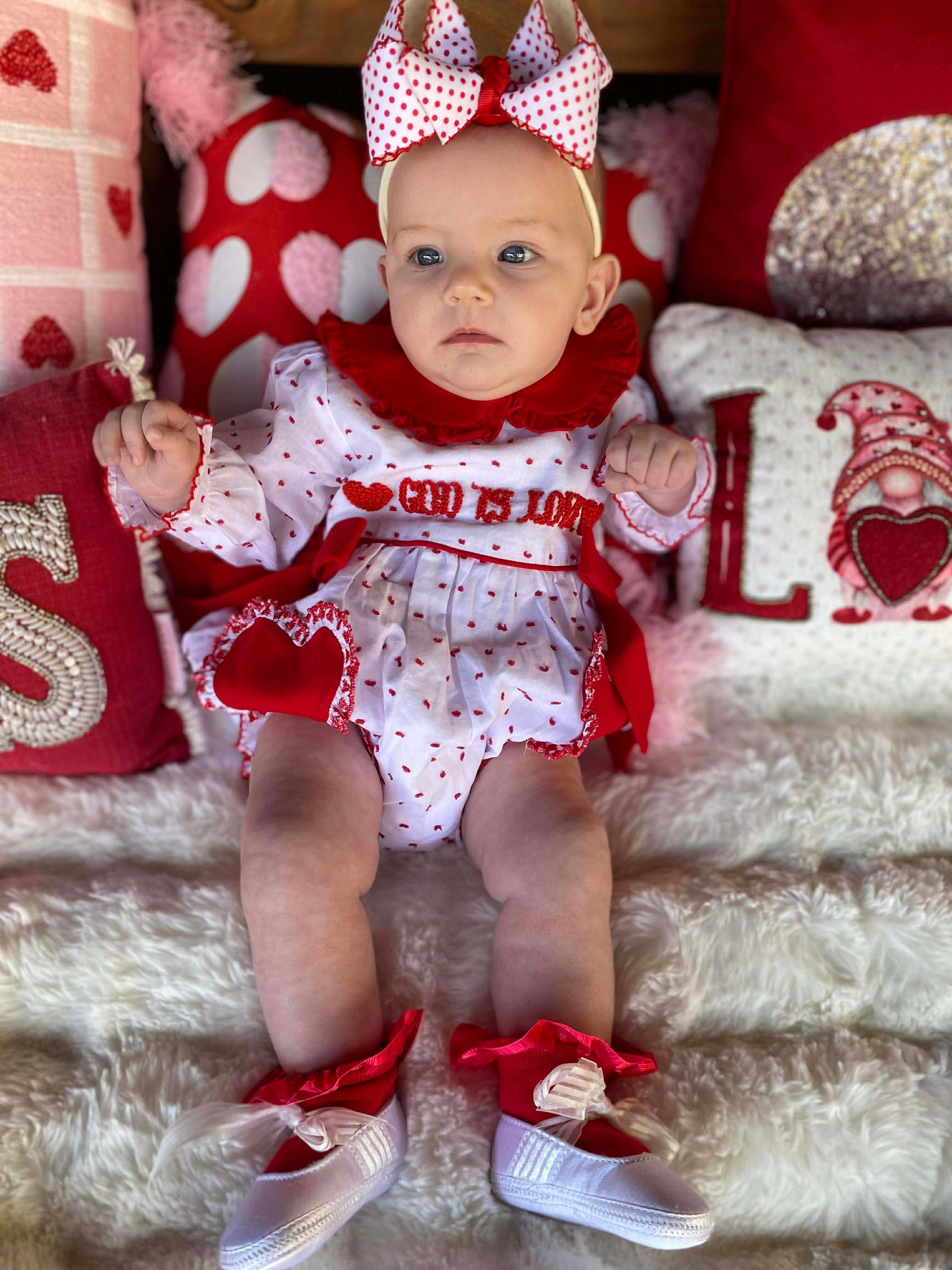Sweet, timeless, and full of meaning — our God Is Love girl bubble is the perfect blend of classic charm and heartfelt detail. This precious bubble features a soft white fabric sprinkled with delicate red Swiss dots and beautifully hand-embroidered French Knot “God Is Love” across the chest, complete with a charming heart accent.