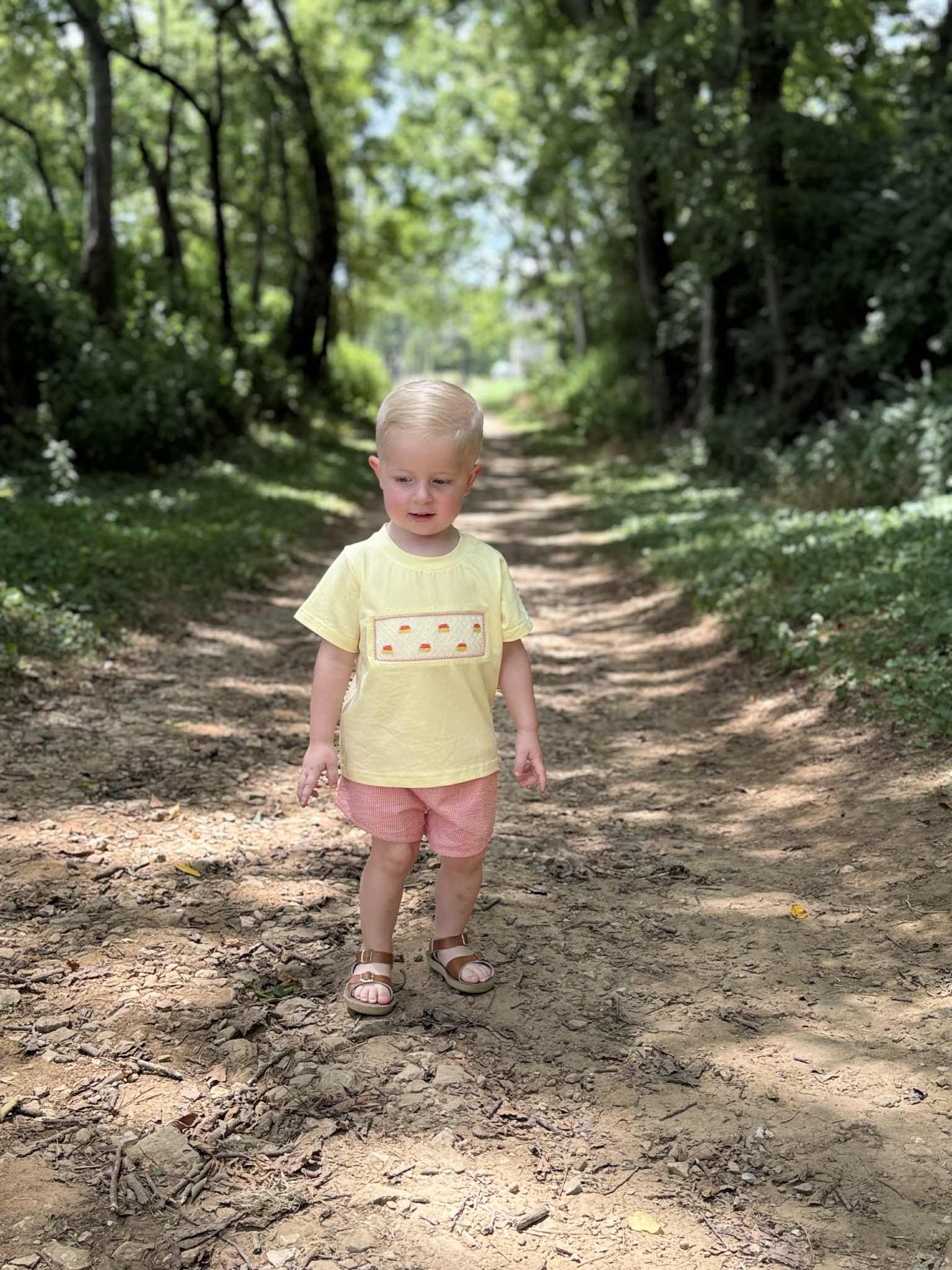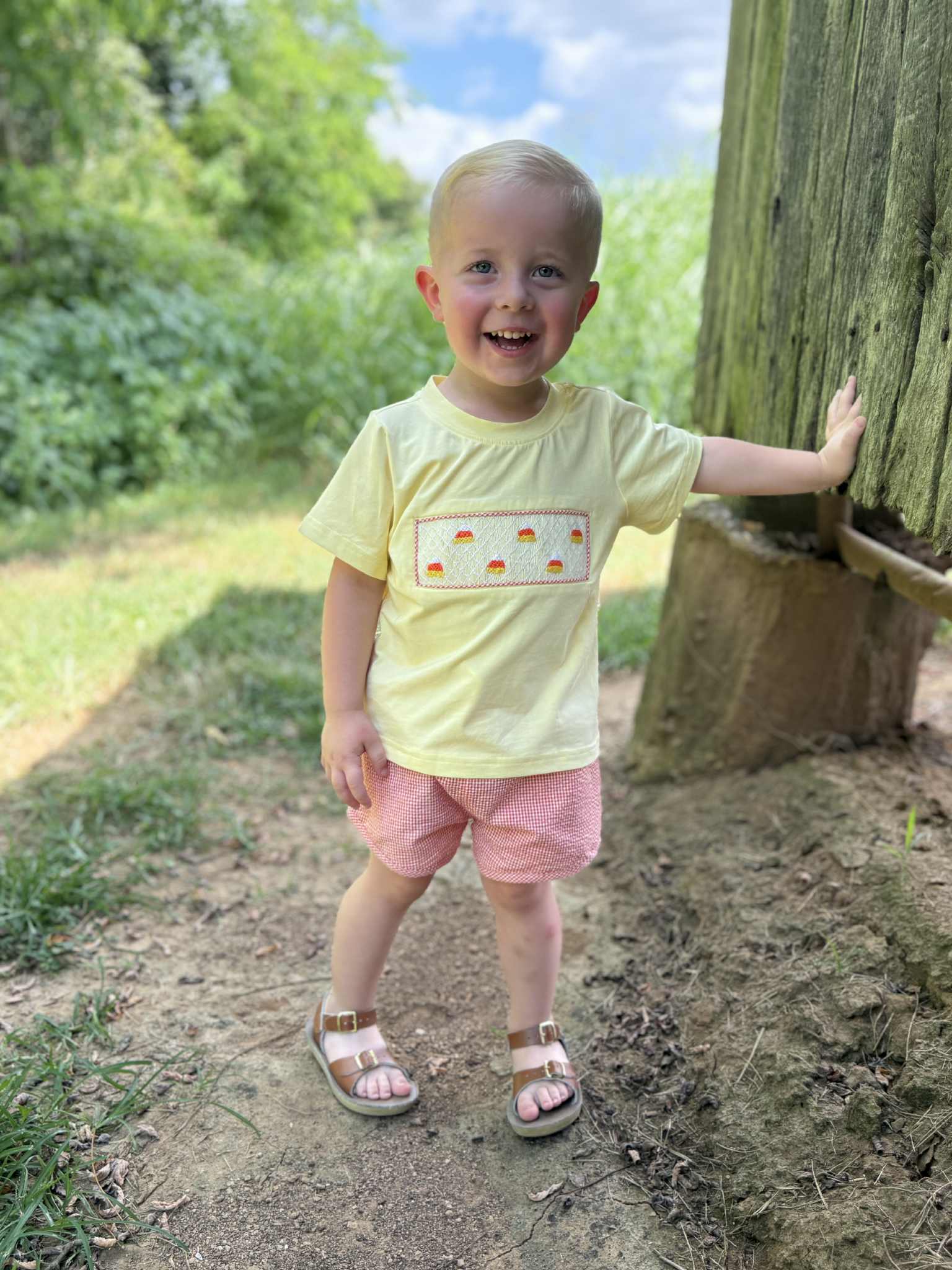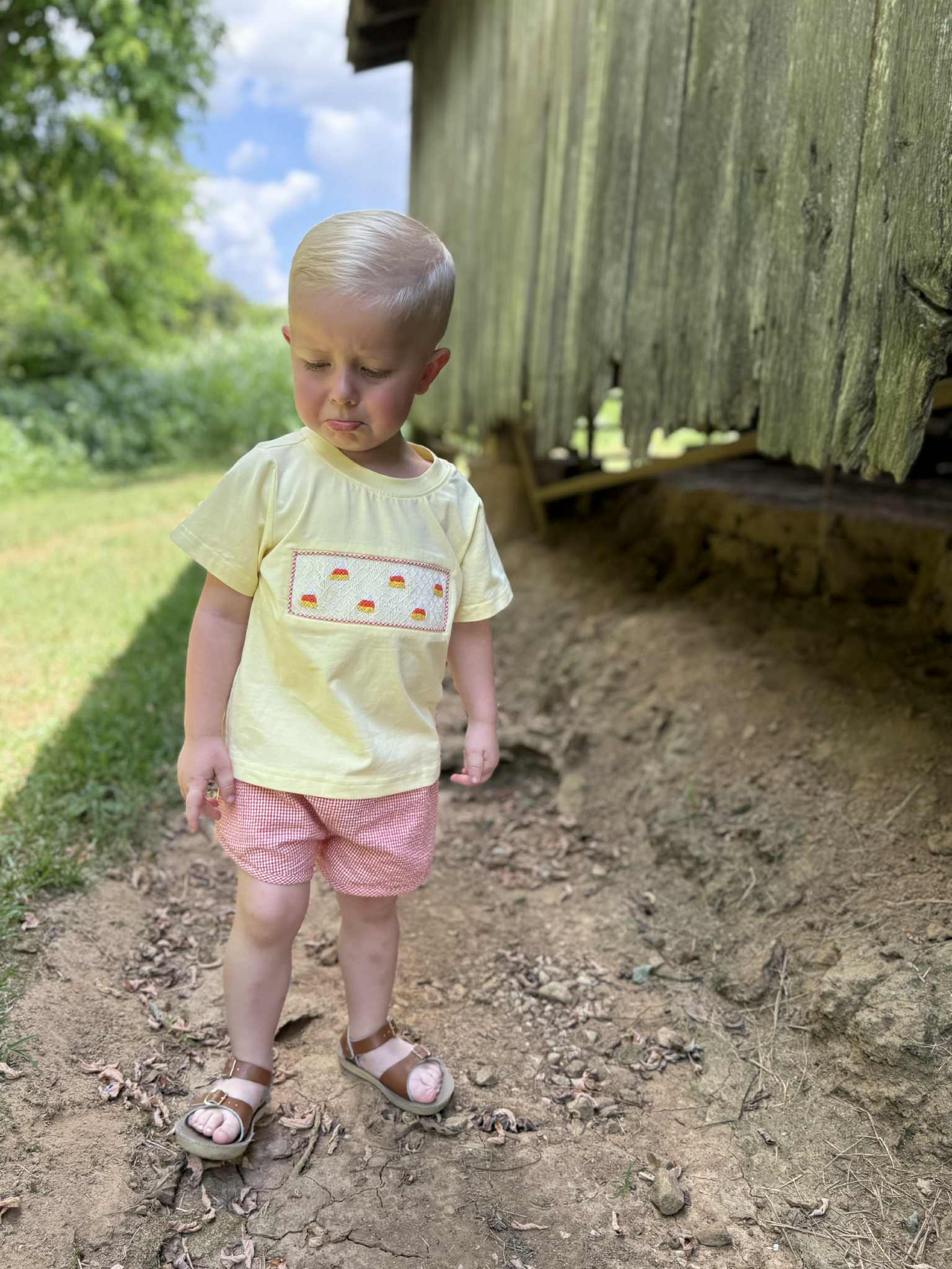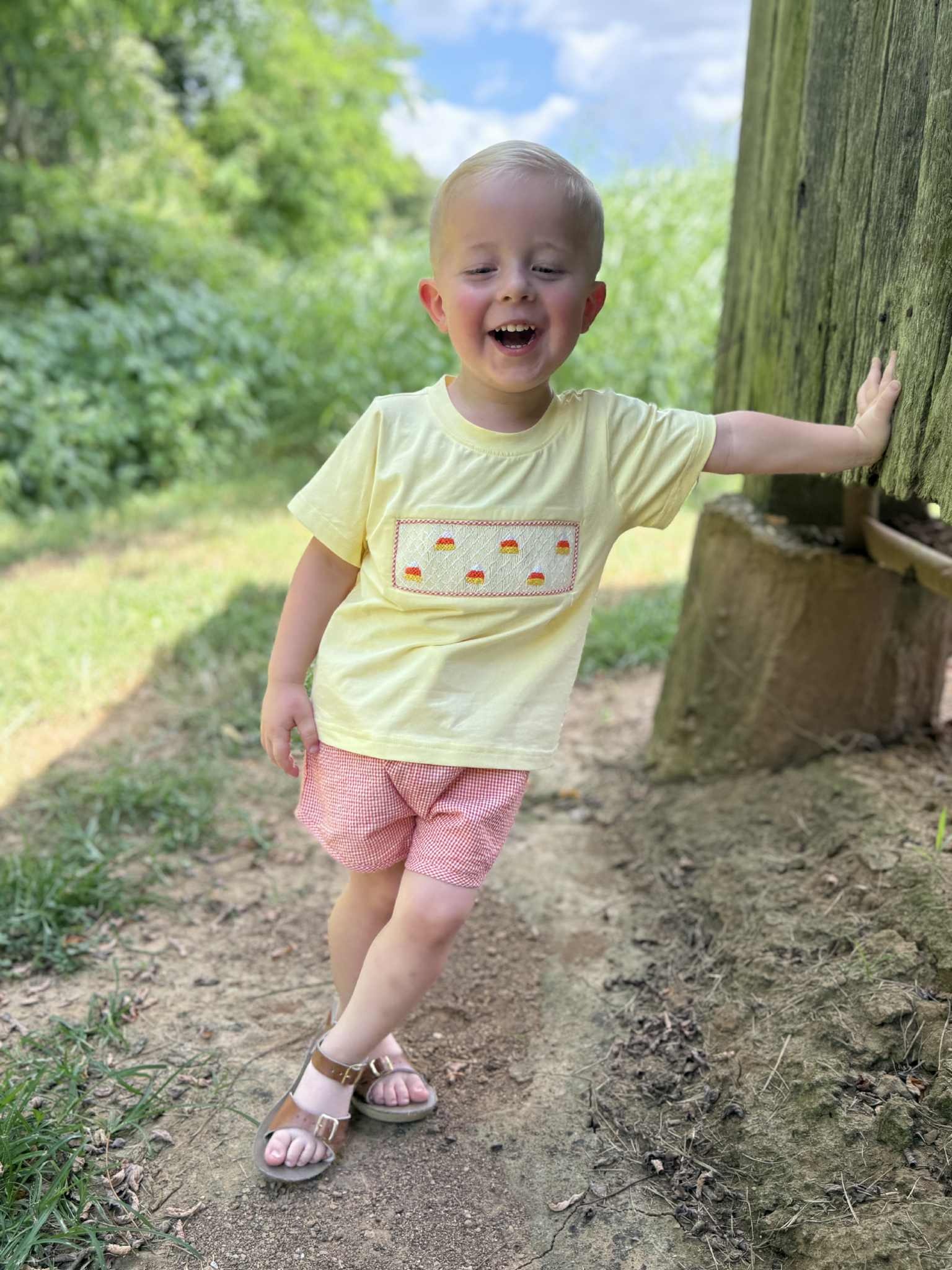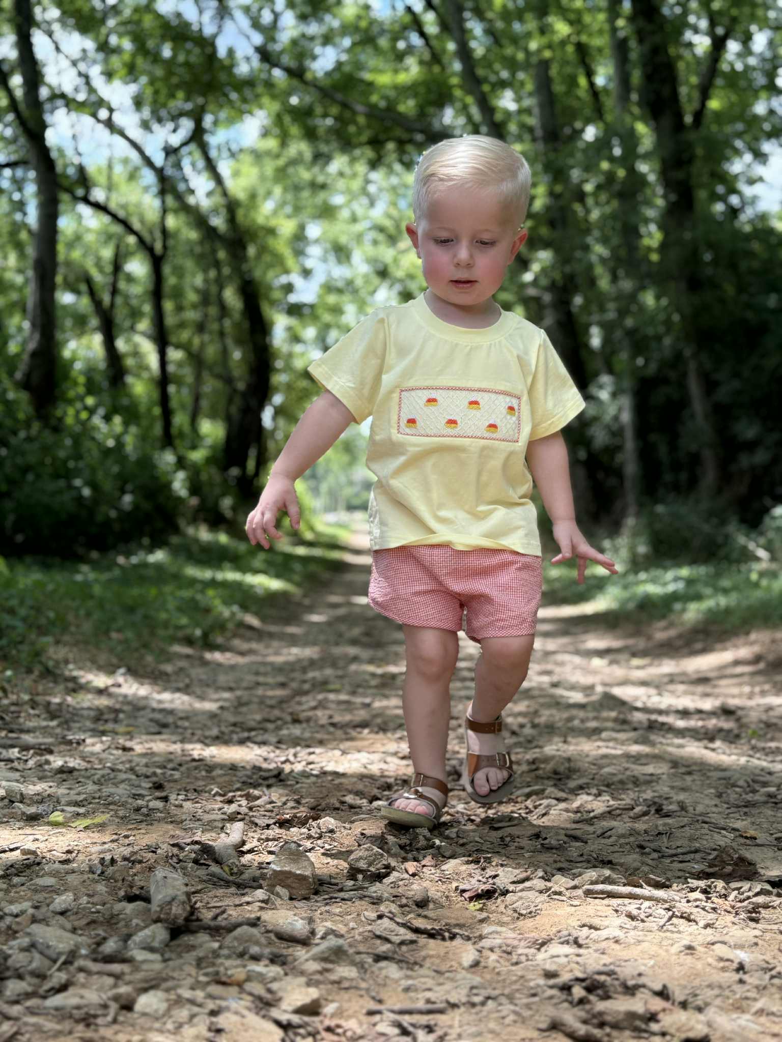 This adorable boys short set features a soft yellow knit shirt with a smocked panel of candy corn — perfectly festive for all things autumn and Halloween. Paired with coordinating orange gingham shorts, this set combines comfort and charm for pumpkin patch outings, school parties, or cozy days at home.